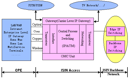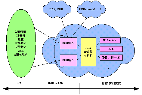 BACKBONE(骨干網)、ISIN ACCESS(接入網)和ISIN CPE(用戶端系統(tǒng)設備),可以構成向用戶提供語音、數據、圖像等綜合業(yè)務的統(tǒng)一的ISIN網絡體系。
