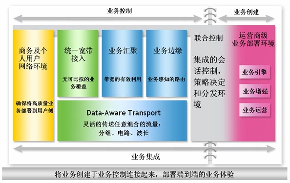 首先,我們提供了智能的、具備業(yè)務(wù)感知能力的、安全的融合網(wǎng)絡(luò):這意味著通過(guò)安全的網(wǎng)絡(luò)將正確的業(yè)務(wù)部署到正確的客戶(hù)端,并保證最高體驗(yàn)質(zhì)量。它的本質(zhì)是在網(wǎng)絡(luò)的各個(gè)層面部署智能化和業(yè)務(wù)感知的元素,并實(shí)施完整的安全機(jī)制,正如我們前面提到的,業(yè)務(wù)演進(jìn)與網(wǎng)絡(luò)間相互有著緊密關(guān)聯(lián),為達(dá)到業(yè)務(wù)需求,網(wǎng)絡(luò)需要能夠根據(jù)業(yè)務(wù)進(jìn)行靈活調(diào)整。