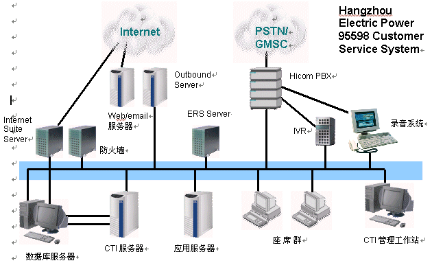 西門子Hicom 350E,作為杭州電力"95598"客服系統(tǒng)的通信服務器,以其出色的品質(zhì)和強大的功能保證了整個系統(tǒng)的正常運行。同時充分利用杭州電力局原有的通訊線路,創(chuàng)新性的在原有的SDH(同步數(shù)字體系)網(wǎng)絡上利用HiPath HG 3200遠端模塊,將中心的人工坐席延伸到了五個郊縣電力公司,真正解決了全市統(tǒng)一接入,一個號碼對外,業(yè)務本地受理的問題;同時遠端坐席的工作方式真正做到和中心完全一致,給使用、管理、培訓等帶來極大的便利。