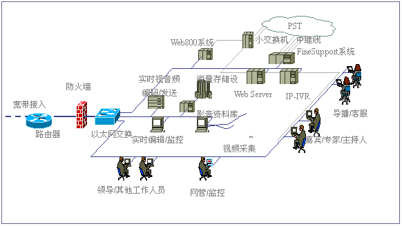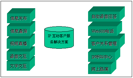 經(jīng)過對(duì)比分析,我們發(fā)現(xiàn),目前國際國內(nèi)市場上很多客戶服務(wù)產(chǎn)品,大都僅僅完成客戶服務(wù)的一部分。北極星“IP互動(dòng)客戶服務(wù)中心解決方案”則引入互動(dòng)客戶服務(wù)(ICS:Interactive Customer Service)系統(tǒng)以及數(shù)碼互動(dòng)直播的概念,形成了由視頻點(diǎn)播、網(wǎng)上路演、語音和文字交互、IP客戶服務(wù)中心、Web800語音電話、實(shí)時(shí)服務(wù)中心、專家實(shí)時(shí)在線、客戶關(guān)系管理、在線尋呼系統(tǒng)和客戶社區(qū)服務(wù)系統(tǒng)等全方位的服務(wù)內(nèi)容。該方案主要基于IP架構(gòu),系統(tǒng)擴(kuò)展性非常靈活,系統(tǒng)體現(xiàn)的客戶服務(wù)思想非常能夠滿足我們的需求。2001年3月,經(jīng)過一段時(shí)間的試運(yùn)行后,我們正式推出了這套“IP互動(dòng)客戶服務(wù)”系統(tǒng)。