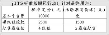 jTTS標準版在聲音質(zhì)量、聲音平滑度、自然度等方面已具有比較高的實用化水平。為了真正啟動語音技術(shù)的應用市場,捷通華聲啟動“颶風行動”,在活動期間為最終客戶、系統(tǒng)集成商制定了一個極具競爭力的價格,并且無平臺費。這次活動主要針對CTI領域中大量中小型系統(tǒng)的應用開展此次活動,目的是讓先進的技術(shù)能夠被更多的用戶采用,為系統(tǒng)集成商應用TTS技術(shù)提供了很高的利潤空間。