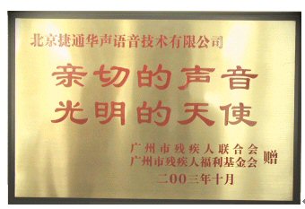 近日,廣州殘疾人聯(lián)合會(huì)授予了北京捷通華聲語(yǔ)音技術(shù)有限公司"親切的聲音,光明的天使"榮譽(yù)稱號(hào),并頒發(fā)了金匾和榮譽(yù)證書,感謝捷通華聲為廣州的社會(huì)福利事業(yè)的近10萬(wàn)元的捐獻(xiàn)與長(zhǎng)期的技術(shù)支持。