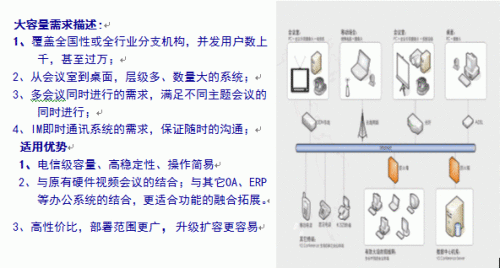 太平洋保險(xiǎn)集團(tuán)下根據(jù)業(yè)務(wù)模式劃分為產(chǎn)險(xiǎn)、壽險(xiǎn)2個(gè)公司,每個(gè)公司在全國各省都有分公司,目前集團(tuán)公司管理著主服務(wù)器,每個(gè)分公司都有自己的從服務(wù)器,總計(jì)60余臺(tái)從服務(wù)器,應(yīng)用的交互點(diǎn)數(shù)1000點(diǎn),旁聽點(diǎn)數(shù)300點(diǎn)。保險(xiǎn)行業(yè)銷售人員流動(dòng)快、各種培訓(xùn)頻繁、新險(xiǎn)種推出層出不窮,其中省分公司、眾多支公司與銷售網(wǎng)點(diǎn)人員的即時(shí)音視頻交流是重中之重,為了滿足客戶要求系統(tǒng)平臺(tái)支持大容量會(huì)議人數(shù)、多會(huì)議同時(shí)召開以及流暢的音視頻交換的要求,國際視訊知名廠商北京威速科技有限公司專門為大企業(yè)級(jí)用戶開發(fā)出了高性能大容量的視頻會(huì)議產(chǎn)品。這種更適用組織機(jī)構(gòu)龐大、更穩(wěn)定的純軟件網(wǎng)絡(luò)視頻會(huì)議平臺(tái),是迄今為止業(yè)內(nèi)唯一勝任單會(huì)議室同時(shí)容納千人以上用戶開會(huì),并支持無限量會(huì)議室,并且通過級(jí)聯(lián)技術(shù)可以同時(shí)支持幾千路音視頻交互并發(fā),同時(shí)實(shí)現(xiàn)一個(gè)集視頻交互、音頻交互、屏幕廣播、遠(yuǎn)程控制、文字交流、電子白板、文檔共享、文件傳輸?shù)榷囗?xiàng)功能于一體的綜合多媒體遠(yuǎn)程會(huì)議平臺(tái)。自V2 conference應(yīng)用以來,承擔(dān)了公司絕大部分遠(yuǎn)程交流任務(wù),太平洋保險(xiǎn)集團(tuán)已把視頻會(huì)議交流當(dāng)作工作的一部分,成為工作之必須的習(xí)慣。極大地提高了企業(yè)運(yùn)作效率、降低了成本,而這些正是金融保險(xiǎn)機(jī)構(gòu)的制勝之道。