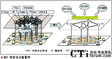 智能節(jié)點重疊網(wǎng)是覆蓋在IP核心網(wǎng)上的傳統(tǒng)的彈性重疊網(wǎng)(RON)技術與分布式哈希表(DHT)技術相結(jié)合的新型重疊網(wǎng)技術,包括自動組網(wǎng)、網(wǎng)絡資源管理、路由優(yōu)化等關鍵技術。其基本結(jié)構(gòu)是保持TCP/IP協(xié)議不變,原來的3層變成3-層,在其上建立一個智能結(jié)點重疊網(wǎng)做為3+層,在此分布式管理平臺上提供流量監(jiān)控、流量控制、QoS、病毒防止和安全性等服務。智能結(jié)點重疊網(wǎng)的另外一個任務是為各種P2P應用提供支撐環(huán)境。它可以為在互聯(lián)網(wǎng)上采用不同協(xié)議和軟件的各種P2P業(yè)務,提供統(tǒng)一的支撐環(huán)境。主要是提供P2P CDN和P2P SIP。智能結(jié)點重疊網(wǎng)如圖2所示。