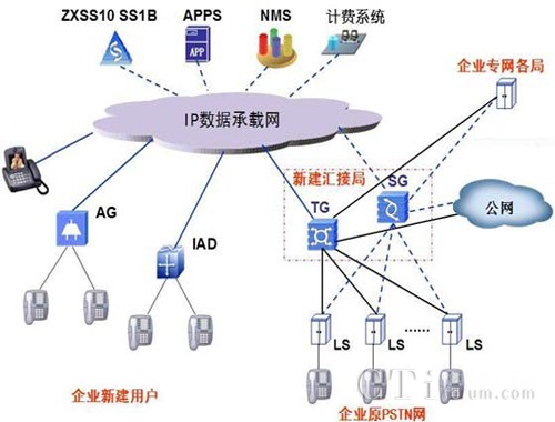 在A城市大企業(yè)總部,將原有的端局通過E1接口連接到TG/SG,在軟交換控制設(shè)備的控制下,實現(xiàn)企業(yè)原有電話和企業(yè)內(nèi)部跨域的各分支之間的VoIP語音長途業(yè)務(wù)。同時通過在TG進行路由配置,實現(xiàn)了企業(yè)軟交換網(wǎng)絡(luò)各IP語音終端與A城市PSTN的互通,實現(xiàn)企業(yè)各地到A城市PSTN網(wǎng)的來話落地。