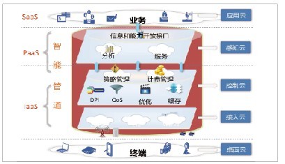 云化的智能管道如圖1所示,包括桌面云->接入云->控制云->感知云->應用云,實際上是端管云一體化的網絡架構,建立一個可以自感知、自學習、自組織、自適配、自管理的數(shù)字神經網絡,提供云化的不同層次業(yè)務。