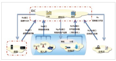 中興通訊增強端到端信息感知和開放接口,提出一套標準架構如圖2所示,來實現(xiàn)整個網絡透明、可視。建設網絡信息采集體系,增強感知云的端到端分析能力;建立“桌面云-感知云”的云端一體化架構,提供網絡推送能力;感知云向終端開放網絡信息和能力,增強用戶感知網絡、定制個人體驗能力;感知云向業(yè)務開放網絡信息和能力,拓展合作發(fā)展增值業(yè)務的能力。