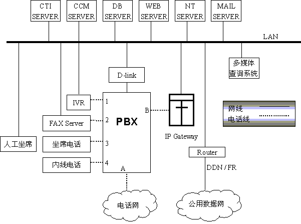 如下圖所示,當(dāng)呼叫從電話網(wǎng)進(jìn)入客戶服務(wù)中心時,PBX(用戶小交換機)響應(yīng)客戶的呼叫,并將呼叫接至系統(tǒng)的IVR(交互式語音應(yīng)答系統(tǒng)),IVR向客戶送提示音:"您好,這里是×××保險公司,請注意:在任何步驟按0中止當(dāng)前操作退出,按*號轉(zhuǎn)傳真,按#轉(zhuǎn)人工坐席。請繼續(xù)操作:查詢公共信息請按1,查詢客戶檔案請按2,查詢營銷員信息請按3",當(dāng)客戶選擇查詢的信息時IVR進(jìn)一步提示直到客戶查到滿意的信息為止。提示語音文字的選擇應(yīng)結(jié)合當(dāng)?shù)乜蛻舻睦斫饬?xí)慣仔細(xì)斟酌。
