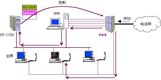 在任何一個步驟中,如客戶選擇了人工坐席,則IVR請求CCM根據(jù)多種情況選擇一個空閑坐席(選擇方法見下文)并控制PBX將呼叫與選擇的人工坐席接通,同時系統(tǒng)在客戶對IVR操作的過程中,已經(jīng)幀測到了客戶所使用的電話號碼、客戶的按鍵信息,系統(tǒng)還記錄有客戶上次的呼叫情況等數(shù)據(jù),這些數(shù)據(jù)基本上可以確定客戶大體關(guān)心的問題,對于老客戶甚至可以初步認(rèn)定呼叫者的身份、年齡、性別、業(yè)務(wù)辦理情況等,因此,話務(wù)員在與客戶談話之前就已經(jīng)了解了相當(dāng)多的信息,并控制選定的坐席屏幕顯示有關(guān)客戶信息,便于直接進(jìn)入正題,提高了效率。客戶與坐席的交流過程中,坐席可通過終端請求CCM控制PBX將本次呼叫與其他話務(wù)員(坐席)、專家或業(yè)務(wù)辦公室(如內(nèi)線電話)等接通,當(dāng)坐席人員將呼叫轉(zhuǎn)移到另一坐席或?qū)<視r,系統(tǒng)將在本呼叫中收集的各類數(shù)據(jù)同時轉(zhuǎn)向下一坐席電腦。在坐席人員解答客戶問題時,可將問題及解答情況收集,便于分析坐席人員的業(yè)務(wù)素質(zhì)和問題傾向,從而有針對性地培訓(xùn)坐席人員。對于客戶來講,他可以通過電話按鍵在話務(wù)員、自動語音、傳真、專家和業(yè)務(wù)辦公室之間漫游,系統(tǒng)將記錄客戶漫游的路徑,對于設(shè)計較好的菜單和路經(jīng)來說,客戶的漫游路徑基本上可以反映出其需求,大量客戶的漫游路徑無疑將反映出市場需求。