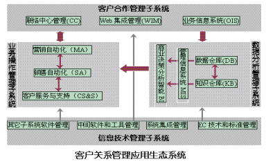 根據(jù)目前IT產(chǎn)業(yè)領(lǐng)域和管理界對CRM的開發(fā)、討論及應用的經(jīng)驗和反饋,綜合來講,一個完整的客戶關(guān)系管理應用系統(tǒng)由如下四大生態(tài)子系統(tǒng)組成: