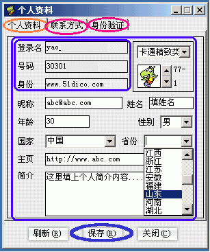 ①點(diǎn)按"個人資料"命令(圖3的B1處),彈出"個人資料"修改窗口,包括"個人資料/聯(lián)系方式/身份驗(yàn)證"這三大類選項(xiàng)卡。其中:"個人資料"選項(xiàng)卡下,除登錄名、號碼和身份這三項(xiàng)不可更改外,其余各項(xiàng)都是可填或可選項(xiàng),據(jù)你所需進(jìn)行修改就是了(下圖4)。另外,還有"聯(lián)系方式"和"身份驗(yàn)證"兩大選項(xiàng),怎么個用法自己點(diǎn)開一看就明白了你!