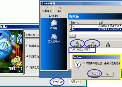3、點(diǎn)按主窗口下方的"覓友"按鈕,彈出的對話框中選擇三種添加方式之一后按"下一步"進(jìn)行好友的添加;當(dāng)有人加你為好友時,系統(tǒng)會有提示音閃并DICO圖標(biāo)在任務(wù)欄不斷閃爍,你點(diǎn)擊上來后會彈出你的DICO郵箱對話框并收到有某某加你為好友的消息,此時可先點(diǎn)按"查看資料"了解一下來人相關(guān)信息;若有意可點(diǎn)按"加產(chǎn)好友"加來訪者為好友(下圖7)。
