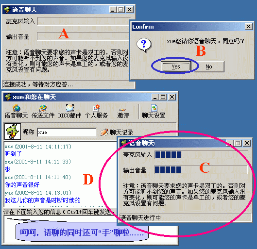 在好友窗口內(nèi)單擊某"在線好友頭像"后選"語音聊天"命令(或在即時聊天窗口中點(diǎn)按"語音聊天"按鈕)后,主動方彈出"正等待對方應(yīng)答窗口提示";而被叫方會彈出"應(yīng)答與否的窗口","YES"后雙方即可聊了(下圖9)。而且,它不受防火墻的限制(下圖就是我與一個在防火墻后的朋友的聊天界面)。在這一點(diǎn)上,QQ就望塵莫及了!