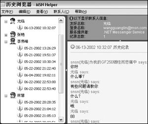 MSN Helper啟動(dòng)時(shí)會(huì)自動(dòng)啟動(dòng)MSN,可以看到在MSN的菜單欄上多了一個(gè)“助手”菜單。在這里“打開歷史瀏覽器”,就可以輕松地查看聊天記錄啦(如圖1)。如果覺得某些聊天的內(nèi)容比較重要,在右邊的記錄窗口里拖選中這些記錄,然后單擊“文件”菜單,將聊天記錄保存或打印出來。