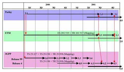 API規(guī)范。這些組織主要包括ITU-T、ETSI、IEEE、IETF、3GPP、OMG、TINA-C、Softswitch論壇、JAIN等。目前,Parlay工作組、ETSI和3GPP已經(jīng)聯(lián)合起來,共同發(fā)展Parlay協(xié)議。圖2為3個標準組織發(fā)布的Parlay版本的對應關系。