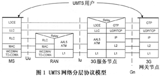 對(duì)圖1的簡(jiǎn)要描述如下:移動(dòng)用戶(hù)(MS)到RAN左側(cè)部分是無(wú)線(xiàn)接入網(wǎng)絡(luò)的無(wú)線(xiàn)用戶(hù)接口(Uu),實(shí)現(xiàn)了用戶(hù)業(yè)務(wù)通過(guò)空中無(wú)線(xiàn)鏈路接入3G網(wǎng)絡(luò)的功能,主要包含物理層(采用WCDMA和TD-CDMA技術(shù))、媒體接入層(MAC)、無(wú)線(xiàn)鏈路層(RLC);在RAN內(nèi)部通過(guò)協(xié)議中繼(Relay)實(shí)現(xiàn)無(wú)線(xiàn)鏈路和有線(xiàn)鏈路的對(duì)接;在RAN和3G服務(wù)節(jié)點(diǎn)之間的接口(Iu)是以ATM技術(shù)為支撐的有線(xiàn)接入段協(xié)議,為支持Internet業(yè)務(wù),采用AAL5適配層協(xié)議,物理層(L1)無(wú)明確限定具體傳輸方式;在此之上,透過(guò)RAN、MS和3G服務(wù)節(jié)點(diǎn)之間存在兩個(gè)高層連接,即邏輯聯(lián)絡(luò)層(LLC)和更為復(fù)雜的第三層實(shí)體(L3CE),L3CE是一些以Client/Server方式構(gòu)件的軟件實(shí)體,實(shí)現(xiàn)諸如無(wú)線(xiàn)資源管理、呼叫控制、移動(dòng)管理等網(wǎng)絡(luò)級(jí)功能;在3G服務(wù)節(jié)點(diǎn)內(nèi)部,為實(shí)現(xiàn)到Internet網(wǎng)絡(luò)的接入,再作一次協(xié)議中繼,這里,第三層實(shí)體的信息映射到通用分組無(wú)線(xiàn)服務(wù)的隧道協(xié)議GTP(GPRS Tunneling Protocol);3G服務(wù)訪(fǎng)問(wèn)點(diǎn)到3G網(wǎng)關(guān)之間的Gn接口存在清晰的、以TCP/IP協(xié)議為主體的五層對(duì)應(yīng)關(guān)系;構(gòu)建在最上層的是移動(dòng)用戶(hù)到3G網(wǎng)關(guān)的UMTS用戶(hù)進(jìn)程,它通過(guò)3G網(wǎng)關(guān)進(jìn)入Internet骨干網(wǎng),最終實(shí)現(xiàn)用戶(hù)對(duì)Internet的訪(fǎng)問(wèn)。