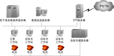 中型呼叫中心:座席代表在50~100之間。據(jù)專業(yè)數(shù)據(jù)統(tǒng)計(jì)公司預(yù)測,中型系統(tǒng)需求量最大,因此不少呼叫中心軟、硬件開發(fā)商對(duì)準(zhǔn)這一目標(biāo)進(jìn)行開發(fā)。這種系統(tǒng)結(jié)構(gòu)相對(duì)簡單,投資也少,容易被中、小企業(yè)所接受。目前我國的一些公司開發(fā)系統(tǒng)多屬于此種類型。它可以省掉大型交換機(jī)的投資,而利用PBX與CTI服務(wù)器和業(yè)務(wù)代表座席直接相連,業(yè)務(wù)代表席同時(shí)與應(yīng)用服務(wù)器相連,客戶資料也存在應(yīng)用服務(wù)器中,可實(shí)時(shí)地將接入電話的客戶姓名自動(dòng)在計(jì)算機(jī)屏幕上彈出。CTI服務(wù)器一般由CTI硬件開發(fā)商的板卡和PC組成,其擴(kuò)容和增加功能也比較方便,成本也低,因此是一種投資小、見效快、升級(jí)也很靈活的系統(tǒng)。