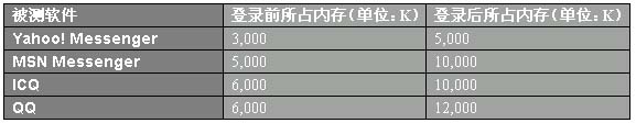 在使用Windows平臺(tái)下的PC也只有內(nèi)存還稍顯珍貴,所以就這四款軟件所占用的內(nèi)存進(jìn)行了對(duì)比。結(jié)果如下:Yahoo! Messenger所占的內(nèi)存,無論在登錄前后都是最小的;第二名,MSN Messenger在功能龐大的情況下,能做得如此精巧實(shí)屬難得;第三名,ICQ從2000版開始對(duì)內(nèi)存的占用始終比較穩(wěn)定,只是在出了中文界面后稍高一些;第四名,QQ啟動(dòng)出現(xiàn)登錄界面時(shí)還沒顯出味口有多大,不想登錄后隨著系統(tǒng)信息和Flash廣告等傳到客戶端占用內(nèi)存的峰值竟然能達(dá)到15,000K,相信內(nèi)存小一些的機(jī)器在QQ登錄后就要多等一會(huì)兒了。