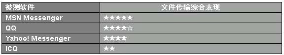 評(píng)測傳輸結(jié)果表明,MSN Messenger 6.0穿防火墻的能力很強(qiáng),而且傳輸速度還不錯(cuò);QQ的速度與MSN Messenger相當(dāng),但防火墻穿越能力和傳輸穩(wěn)定性上略遜一籌;Yahoo! Messenger對(duì)50M的文件好像有點(diǎn)消化不良;ICQ的傳輸成功率幾乎為20%,成功后效果也不盡如人意。