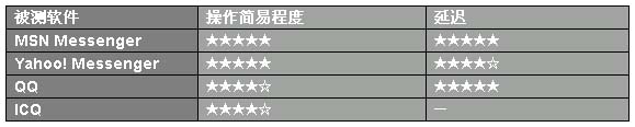 MSN Messenger和Yahoo! Messenger的操作都很簡單,只是MSN Messenger在同樣的畫質(zhì)下延遲要小于Yahoo! Messenger,表現(xiàn)出更優(yōu)的實(shí)用性。QQ操作也不算太復(fù)雜,只是會(huì)員和非會(huì)員在功能上有一些限制,不過在同畫質(zhì)的延遲方面做的算是出色,ICQ操作沒有測試成功。
