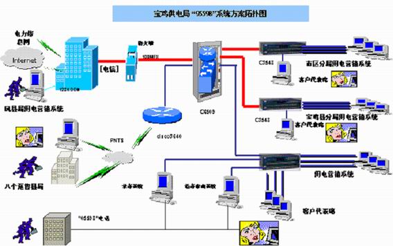 、 利用現(xiàn)有的計算機網(wǎng)絡基礎實現(xiàn)市區(qū)供電分局、寶雞縣供電分局、鳳縣供電分局三個供電分局與局客戶服務中心的信息聯(lián)結;