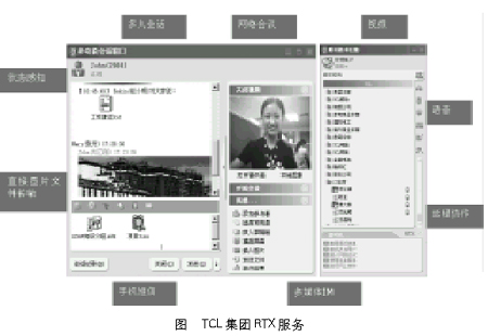 RTX產(chǎn)品支持標準的SIP、H.323 IP電話協(xié)議,并采用高質量的QoS技術保證實時通信網(wǎng)絡質量,使得TCL集團公司的用戶可以與同事之間采用語音或者視頻的面對面的交流(如圖),相當于給集團公司的任何一位RTX用戶配備了一部集成的視頻和語音電話。目前這項服務在集團公司非常受歡迎,尤其是遠程的代表處和集團總部之間的信息交流更直接、更快捷,在一定程度上取代了電話的功能,大大節(jié)約了通信費用。比如,TCL空調的計劃部每天需要和全國20多個代表處的計劃處進行數(shù)據(jù)往來,以前需要電話完成的功能現(xiàn)在通過RTX的即時文字、短信和語音對講完成,大大提高效率,節(jié)省了通信成本。