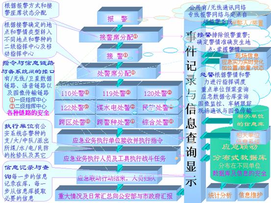 根據(jù)接過(guò)來(lái)的警情,應(yīng)急聯(lián)動(dòng)系統(tǒng)向處置力量部門(mén)發(fā)出指令派出處置力量編組到現(xiàn)場(chǎng),并根據(jù)現(xiàn)場(chǎng)反饋回來(lái)的信息,決定是否增援或歸隊(duì)。事件記錄通過(guò)局域網(wǎng)被送到相應(yīng)的處警員終端,處警員通過(guò)計(jì)算機(jī)輔助調(diào)度系統(tǒng)查詢相關(guān)資料,制定反應(yīng)措施,并向相關(guān)聯(lián)動(dòng)單位發(fā)出具體調(diào)度指令。在緊急事件發(fā)生時(shí),相應(yīng)的電子預(yù)案會(huì)被觸發(fā)啟動(dòng)。如果發(fā)生了重大災(zāi)難,險(xiǎn)情或特殊的事件,則可以啟用城市緊急狀態(tài)指揮室,由首長(zhǎng)進(jìn)行統(tǒng)一指揮。