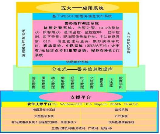 支撐平臺(tái)有計(jì)算機(jī)網(wǎng)絡(luò)系統(tǒng)、監(jiān)控系統(tǒng)、顯示系統(tǒng)、GPS系統(tǒng)、有/無(wú)線通信系統(tǒng)、圖像傳輸系統(tǒng)、電源及機(jī)房、軟件支撐平臺(tái)等。其中,計(jì)算機(jī)網(wǎng)絡(luò)系統(tǒng)包括指揮中心、二級(jí)指揮中心與移動(dòng)指揮中心、業(yè)務(wù)執(zhí)行機(jī)構(gòu)(如:應(yīng)急中隊(duì)、派出所等)之間的三級(jí)計(jì)算機(jī)網(wǎng)絡(luò),即指揮中心局域網(wǎng)絡(luò)、業(yè)務(wù)機(jī)關(guān)網(wǎng)絡(luò)、與分支機(jī)關(guān)的廣域網(wǎng)絡(luò)、與移動(dòng)指揮中心的遠(yuǎn)程訪問(wèn)網(wǎng)絡(luò)。指揮中心與二級(jí)指揮中心、分支機(jī)構(gòu)、移動(dòng)中心之間有語(yǔ)音通信、數(shù)據(jù)通信,指揮中心與移動(dòng)中心有語(yǔ)音通信、數(shù)據(jù)通信(無(wú)線)、現(xiàn)場(chǎng)圖像傳輸;指揮中心與公安其它機(jī)構(gòu)通過(guò)撥號(hào)網(wǎng)絡(luò)訪問(wèn)(內(nèi)網(wǎng)),指揮中心與普通老百姓通過(guò)撥號(hào)網(wǎng)絡(luò)訪問(wèn)(外網(wǎng))。