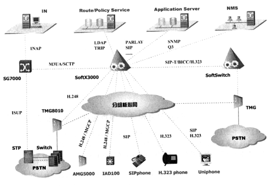總之,基于IP軟交換的網(wǎng)絡(luò)是一個(gè)融合網(wǎng)絡(luò),包括PSTN/ISDN、H.323、ATM/IP等各種網(wǎng)絡(luò)。SIP協(xié)議是NGN多媒體通信協(xié)議,用于軟交換、SIP服務(wù)器和SIP終端之間的通信控制和信息交互,擴(kuò)展的SIP-T可使SIP消息攜帶ISUP信令;在需要媒體轉(zhuǎn)換的地方可設(shè)置媒體網(wǎng)關(guān),H.248/Megaco為媒體網(wǎng)關(guān)控制器(MGC),用于控制媒體網(wǎng)關(guān),完成媒體轉(zhuǎn)換功能,它并不負(fù)責(zé)呼叫控制功能;H.323也是多媒體通信協(xié)議,它比SIP、H.248/Megaco的發(fā)展歷史更長(zhǎng),是一項(xiàng)復(fù)雜的協(xié)議,升級(jí)和擴(kuò)展性不是很好,SIP+H.248/Megaco可取代H.323,為了與H.323網(wǎng)絡(luò)互通,NGN必須支持該項(xiàng)協(xié)議;SIGTRAN用于解決IP網(wǎng)絡(luò)承載七號(hào)信令的問(wèn)題,它允許七號(hào)信令穿過(guò)IP網(wǎng)絡(luò)到達(dá)目的地;BICC可使ISUP協(xié)議在不同承載網(wǎng)絡(luò)(ATM、IP、PSTN)上傳送。