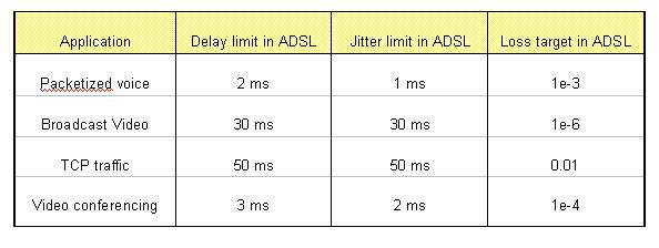 本節(jié)以ADSL承載的幾種典型業(yè)務(wù)為例,討論如何保證不同應(yīng)用的QoS要求。為保證不同應(yīng)用的QoS要求,ADSL設(shè)備可通過(guò)對(duì)不同的業(yè)務(wù)進(jìn)行分級(jí),以Diffserv的方式提供不同的分級(jí)所需的QoS質(zhì)量。例如可將語(yǔ)音業(yè)務(wù)(VoIP)和視頻會(huì)議設(shè)為最高優(yōu)先級(jí),廣播視頻業(yè)務(wù)設(shè)為較高優(yōu)先級(jí),其他如Web瀏覽等業(yè)務(wù)設(shè)為低優(yōu)先級(jí)。ADSL設(shè)備為每個(gè)優(yōu)先級(jí)設(shè)立獨(dú)立的隊(duì)列,然后采用嚴(yán)格優(yōu)先級(jí)或帶有權(quán)重的循環(huán)機(jī)制控制各優(yōu)先級(jí)隊(duì)列的輸出。通過(guò)調(diào)整不同優(yōu)先級(jí)隊(duì)列的buffer大小和最長(zhǎng)留駐時(shí)間,可滿足不同應(yīng)用對(duì)時(shí)延、抖動(dòng)、包丟失率的不同要求。