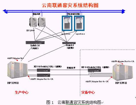 本期工程采用了HP高端磁盤陣列XP512進行遠程數據容災,在云南聯通業(yè)務中心本地新增一臺HP XP512。同時,在異地備份中心新增一臺XP512存儲服務器,作為主生產中心XP512的異地容災備份。本次容災的建設目標是對綜合營帳系統、專業(yè)計費、短消息計費系統進行同城異地數據級容災的綜合數據容災系統,業(yè)務系統的數據將可以通過基于XP磁盤陣列的Continuous Access XP軟件實時同步復制到備份數據中心的XP512中,從而實現數據的遠程保護