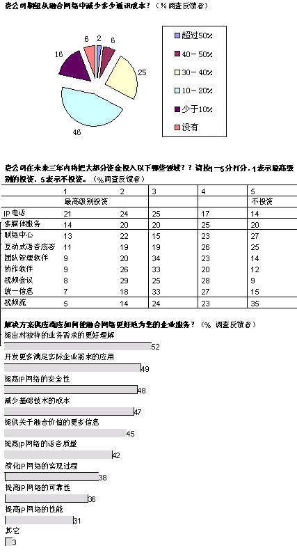 盡管如此,雖然IP融合的真正長期效益可能有利于提高員工效率,但是投資必須得到公司首席財務(wù)官的認(rèn)可。在總體網(wǎng)絡(luò)成本中預(yù)計可以節(jié)約多少?大多數(shù)公司希望削減10%-20%的費用,也有相當(dāng)一部分公司期望減少30%-40%的費用。上述報告中提到的實例中表明,這樣的節(jié)約是可以實現(xiàn)的。