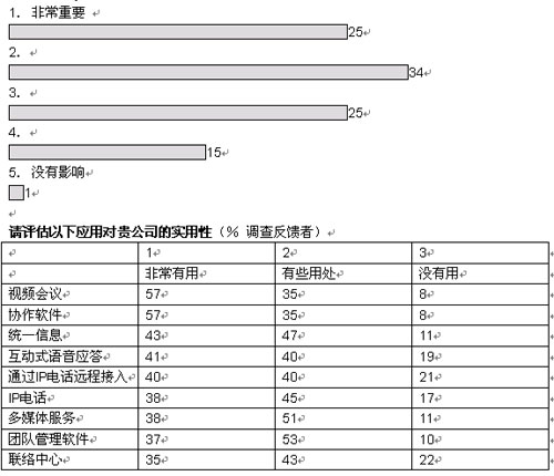 我們調(diào)查的企業(yè)中,有超過三分之二將在未來五年內(nèi)實現(xiàn)大多數(shù)或者所有部門向融合網(wǎng)絡(luò)的轉(zhuǎn)型。大部分企業(yè)采取按部就班的形式在某些特殊部門和業(yè)務(wù)開始部署。在融合應(yīng)用中,IP語音電話將在未來三年內(nèi)吸引大量投資;管理人士期望通過大幅削減公司內(nèi)部的通話費用獲得早期的回報。在更廣泛的層面上,大多數(shù)管理者預(yù)計,融合網(wǎng)絡(luò)對其企業(yè)的商業(yè)影響將會“非常重要”或者“重要”。