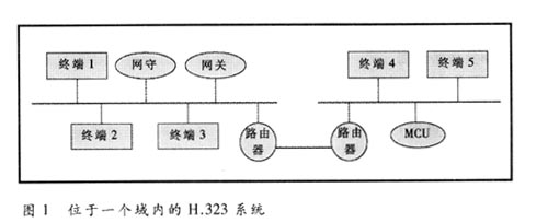 一個(gè)簡(jiǎn)單的基于H.323的視訊會(huì)議系統(tǒng)包括網(wǎng)守(GK)、網(wǎng)關(guān)(GW)、多點(diǎn)控制單元(MCU)和所有終端的集合。圖1是在常見(jiàn)的一種域類(lèi)型中的H.323系統(tǒng)。