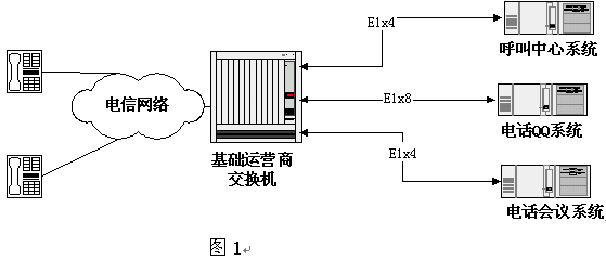 一種方式為固定分配, 即為每種語音系統(tǒng)分配固定數(shù)量的E1中繼,如圖1所示,這種方式的問題主要有兩個(gè)方面:一是中繼資源沒有充分共享使用,比如在晚上,可能電話QQ業(yè)務(wù)量很大而呼叫中心很小,而白天卻正好相反。如果為每一種業(yè)務(wù)都留有很大的中繼富裕又勢必導(dǎo)致中繼資源的浪費(fèi);二是當(dāng)中繼線路來源于多個(gè)運(yùn)營商時(shí)存在連接上的困難。