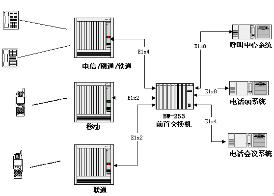 - 能與多個(gè)運(yùn)營商的交換機(jī)連接,將呼叫分配到后端的多種語音業(yè)務(wù)系統(tǒng)。