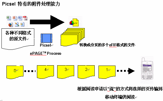 在計算機(jī)上的電子郵件的各種格式文件附件無需任何特殊處理、無需同步和轉(zhuǎn)換可以在移動終端上閱讀。并且電子郵件的附件可以被進(jìn)一步壓縮使其通過網(wǎng)絡(luò)下載更為經(jīng)濟(jì),壓縮后服務(wù)器將文件以"流"傳送,這意味著用戶無需等待一個多頁的文件完全下載完畢后再閱讀,可以選擇任何一頁下載閱讀。