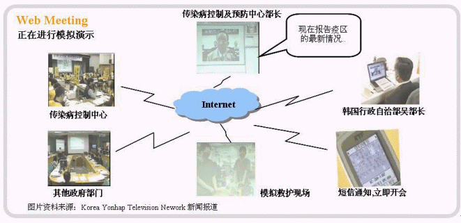 在韓國已經(jīng)安排多次的模擬演示,當(dāng)疫情在韓國發(fā)生及蔓延時,由韓國傳染病控制及預(yù)防中心發(fā)出開會通知,召集其他緊急醫(yī)療機(jī)構(gòu)、專家及政府部門(如行政自治部)等,一起進(jìn)行視像會議。在會議上,傳染病控制中心將各地收集回來的最新情況及報表共享給參會人及團(tuán)體。由各專家一起分析現(xiàn)況,進(jìn)行討論、判斷及決定解決辦法及措施。同時要求其他政府部門協(xié)調(diào)與全力幫助,目的是將疫情在最短的時間及在最少的范圍內(nèi)得到控制及處理,減少對人民生命安全及國家損失的影響。先進(jìn)的通訊科技能加快對危機(jī)發(fā)生時,政府相關(guān)部門及機(jī)構(gòu)對事件的了解、分析、處理及決策,準(zhǔn)確傳達(dá)信息、加強(qiáng)信息的交流、提高辦事效率、加快決策速度以及落實(shí)措施及處理方法的執(zhí)行。最重要的事,將各方面的損失降到最低的程度,避免了事情的惡化及波及其他范圍的負(fù)面影響。
