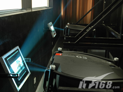 為了達(dá)到足夠大的尺寸,主屏幕采用SEAPRINE圖像控制器組成的1*2拼接,也就是采用了兩臺BARCO G5投影機(jī)來確保畫面的一流效果。不過由于投影距離的限制,這個(gè)方案里采用了二次反射系統(tǒng)。這也是這套方案的一個(gè)要點(diǎn)和關(guān)鍵。因?yàn)楹芏喙こ處熇靡恍└怕蕘砉浪阋淮位蚨啻握凵淇梢钥s短的投影距離,但欠缺科學(xué)和嚴(yán)謹(jǐn)?shù)膽B(tài)度,因?yàn)檫@個(gè)數(shù)據(jù)與屏幕安裝高度、投影方式(離軸或偏軸)、投影機(jī)體積、反射鏡面積等息息相關(guān)。
