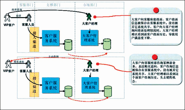 投訴的后臺處理流程分布在BOSS系統(tǒng)、1860客服中心、DSMP數(shù)據(jù)業(yè)務(wù)管理平臺以及OA多個(gè)業(yè)務(wù)支撐系統(tǒng)之中,系統(tǒng)之間相對獨(dú)立,同時(shí)投訴的交互數(shù)據(jù)分散在各個(gè)系統(tǒng)內(nèi),沒有一個(gè)完整、統(tǒng)一的客戶投訴資料,從而無法在不同的服務(wù)渠道中取得完整的客戶投訴信息,影響了客戶服務(wù)的質(zhì)量。當(dāng)公司管理層需要了解某一項(xiàng)活動的開展情況或近期的投訴熱點(diǎn)、焦點(diǎn)問題時(shí),操作人員只能采用傳真方式,臨時(shí)要求全省17地市、公司在一定時(shí)間內(nèi)上報(bào),匯總后研究分析再行提交,使投訴熱點(diǎn)或焦點(diǎn)問題不能及時(shí)反饋給管理層。信息嚴(yán)重滯后,更談不上針對客戶投訴咨詢熱點(diǎn)問題進(jìn)行數(shù)據(jù)挖掘,推出針對性的營銷策略。
