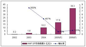 2005年中國運營商對WAP沉默用戶的清理和一系列內容監(jiān)管措施使得WAP市場前兩年的高速增長勢頭減緩,SP市場規(guī)模增長率下探至75%,規(guī)模達17.9億元。諾盛預計由于運營商監(jiān)管政策的連續(xù)性及其對免費WAP網(wǎng)站的政策調整,2006年的WAP市場仍然無法恢復2004年以前的高速增長勢頭,但增長率略有回暖,達到120%。