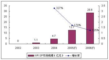 由于運營商的監(jiān)管和增量市場需求的減少,2005年IVR高速增長的勢頭有所回落,市場增長速度趨于理性,SP市場份額增長率為170%,整體SP市場份額達到12.7億元。諾盛預計2006年IVR市場增長率將繼續(xù)回調,但絕對增長率仍然較快,達到125%。