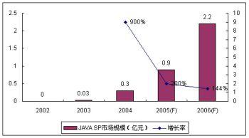 作為SP和移動運營商都非常看好的業(yè)務,JAVA業(yè)務受到眾多SP的青睞。盡管作為JAVA主要業(yè)務的手機游戲目前盈利狀況普遍欠佳,但空中網(wǎng)、美通無線、數(shù)字魚等SP仍然大量投入,期待著未來業(yè)務的高速增長。受制于終端和JAVA游戲的表現(xiàn)力,2005年JAVA業(yè)務的SP市場規(guī)模增長率回落到200%,諾盛預計2006年JAVA的使用環(huán)境沒有太大變化,其增長率進一步回落至144%。
