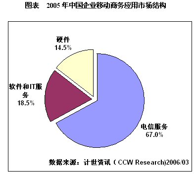 目前,我國(guó)移動(dòng)商務(wù)市場(chǎng)仍處于萌芽期,根據(jù)計(jì)世資訊(CCW Research)《2005-2006中國(guó)移動(dòng)商務(wù)應(yīng)用發(fā)展趨勢(shì)研究報(bào)告》數(shù)據(jù),2005年中國(guó)企業(yè)移動(dòng)商務(wù)應(yīng)用市場(chǎng)規(guī)模為112.5億元,其中硬件投資為16.3億元,軟件與IT服務(wù)投資為20.8億元,電信服務(wù)投資達(dá)到75.4億元,占有整體市場(chǎng)的67.0%。