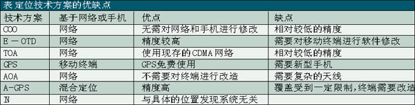 基于移動(dòng)終端的定位技術(shù)包括全球定位系統(tǒng)——GPS、基于移動(dòng)終端信號(hào)發(fā)送和接收的時(shí)戳或角度的技術(shù)——E-OTD(增強(qiáng)觀測(cè)時(shí)間差分)/TOA(到達(dá)時(shí)間),以及來源蜂窩小區(qū)——COO技術(shù)(還有所謂的輔助GPS—A-GPS技術(shù)作為對(duì)COO技術(shù)的補(bǔ)充)。