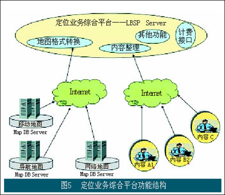 在上述結(jié)構(gòu)中,定位業(yè)務(wù)綜合平臺(tái)LBSP扮演著重要角色。其功能結(jié)構(gòu)如圖5所示。在該平臺(tái)中提供位置類信息業(yè)務(wù)的業(yè)務(wù)運(yùn)營(yíng)支撐功能,包括計(jì)費(fèi)功能(以及和BOSS系統(tǒng)的接口);同時(shí)該平臺(tái)還扮演著接入不同內(nèi)容開發(fā)商的重要角色。不同的內(nèi)容開發(fā)和提供商通過該平臺(tái)向最終用戶提供具體的業(yè)務(wù)和應(yīng)用,運(yùn)營(yíng)商通過該平臺(tái)對(duì)不同內(nèi)容開發(fā)商提供的內(nèi)容進(jìn)行管理和整理,使面向用戶的應(yīng)用能夠順利得到展現(xiàn)。該平臺(tái)提供的另一個(gè)重要角色是肩負(fù)著接入地圖信息提供商的重任,并在該平臺(tái)中通過地圖格式的轉(zhuǎn)換使不同地圖提供商所提供的地圖信息能夠以一致的格式向用戶提供。