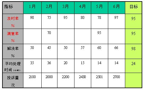 及時率:雖然在6月達到了97%,高于目標值95%,但從1-6月份波動的情況來看,其表現(xiàn)為大幅波動,我們認為此指標處理失控狀態(tài),是沒有管理的或管理是無效的,必須加強管理;