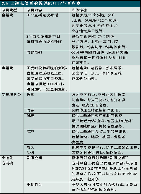 上海電信是國(guó)內(nèi)關(guān)注并切入IPTV業(yè)務(wù)較早的電信運(yùn)營(yíng)商之一,自2005年就開始積極測(cè)試和試驗(yàn)。此次上海電信在全上海市范圍內(nèi)推出IPTV業(yè)務(wù),被業(yè)界看作是“中國(guó)IPTV規(guī)模商用的新紀(jì)元”。除了影視節(jié)目收看、視頻內(nèi)容點(diǎn)播、時(shí)移功能外,上海電信的IPTV服務(wù)還包括時(shí)事新聞、遠(yuǎn)程醫(yī)療、視頻房產(chǎn)信息、餐飲信息、天氣預(yù)報(bào)、票務(wù)查詢等信息服務(wù)以及可視電話、IPTV游戲等個(gè)性化應(yīng)用。其中IPTV的直播頻道有58個(gè),視頻點(diǎn)播可選節(jié)目量達(dá)3000小時(shí)以上。另外,上海電信還推出了影像空間和電視大黃頁(yè)等應(yīng)用服務(wù),攝像愛好者可以利用“影像空間”應(yīng)用平臺(tái)上傳自己的視頻作品,然后通過IPTV機(jī)頂盒在自家的電視上欣賞自己的得意之作,并可以與已安裝IPTV的親朋好友一起分享;電視大黃頁(yè)可實(shí)現(xiàn)對(duì)各類行業(yè)、企事業(yè)單位信息資訊的搜索查詢。