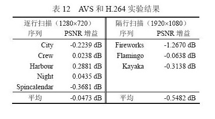 profile的客觀編碼性能。結(jié)果為相同碼率條件下峰值信噪比PSNR的增益?梢钥闯觯珹VS相對(duì)于MPEG-2標(biāo)準(zhǔn)編碼效率平均提高2.56dB,相比于H.264標(biāo)準(zhǔn)編碼效率略低,平均有0.11dB的損失。