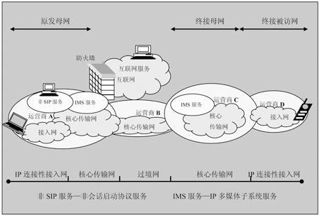 如圖3所示,與一個被訪問的網(wǎng)不同,IP多媒體子系統(tǒng)還支持母網(wǎng)的概念。在這個例子中,母網(wǎng)是支持具有登錄權(quán)的IP多媒體子系統(tǒng)的核心網(wǎng)。被訪問的網(wǎng)是當前向用戶提供IP多媒體子系統(tǒng)服務(wù)連接的網(wǎng)。圖3中的運營商A擁有許多疊接網(wǎng)用戶的母網(wǎng),而運營商C擁有移動電話的母網(wǎng),而用戶正在運營商D的網(wǎng)絡(luò)中漫游。